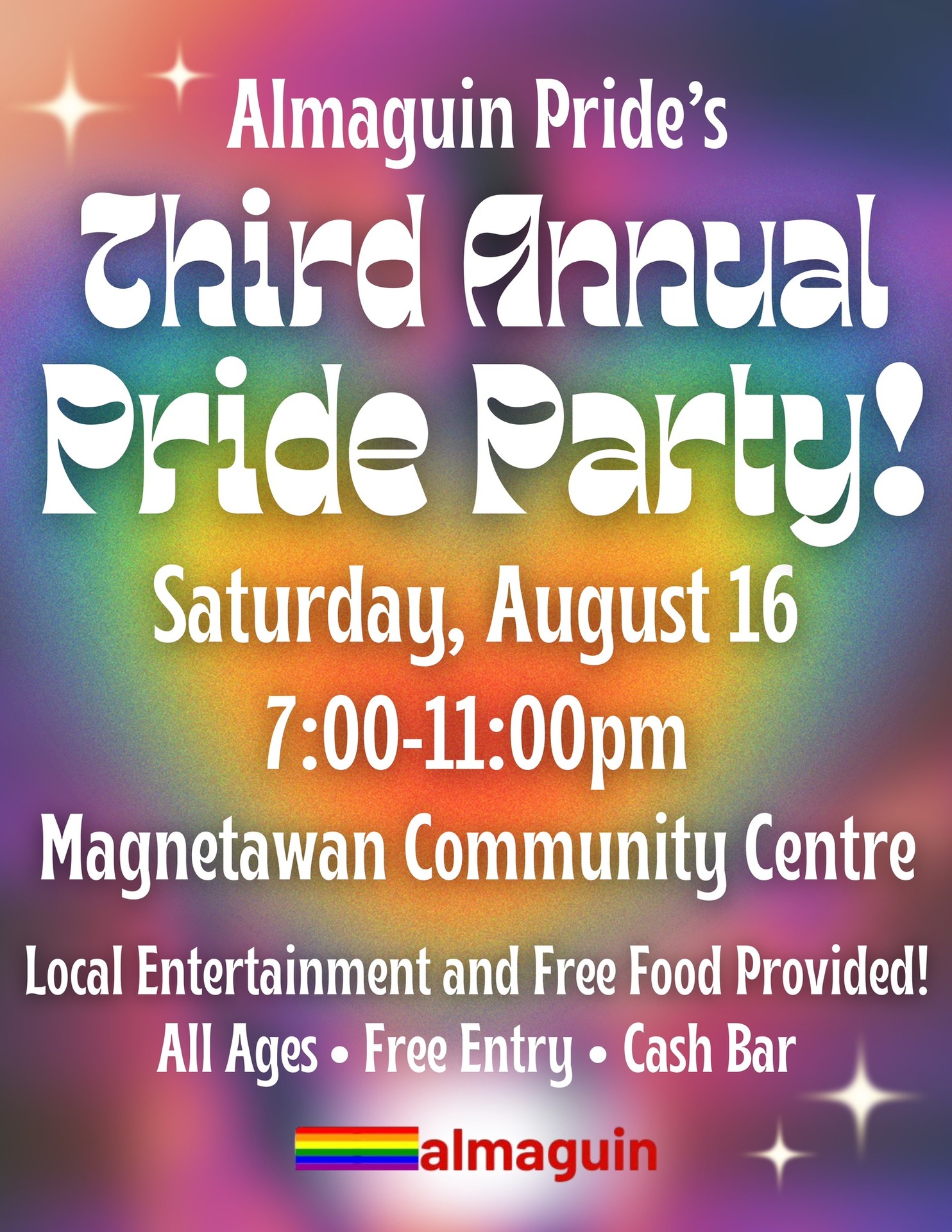 Join us on Saturday, August 16th from 7:00 to 11:00pm at the Magnetawan Community Centre for a night of fun and celebration! Featuring local entertainment (to be announced soon!), a silent auction, free food, and a cash bar, the Third Annual Pride Party is back and better than ever! Come celebrate the LGBTQ+ community in Almaguin in style!