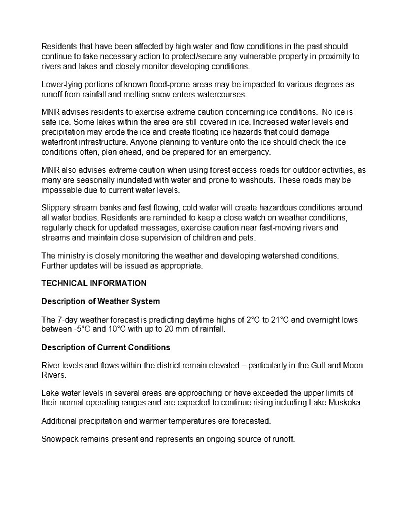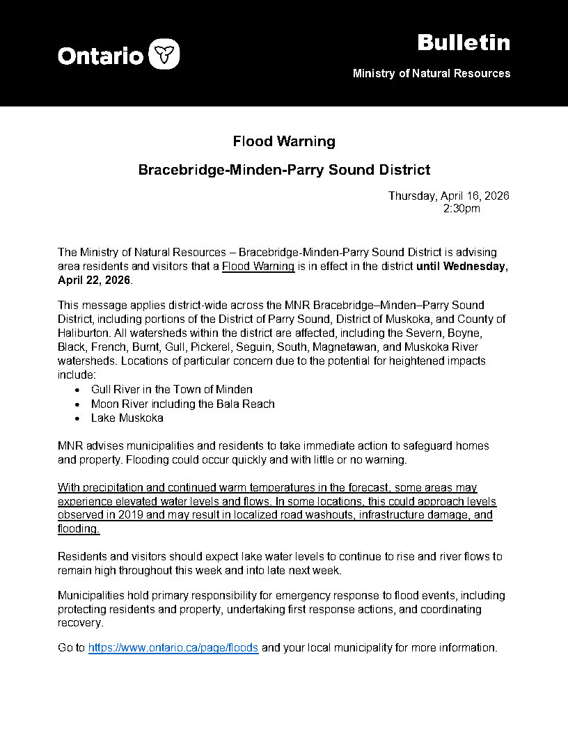 April 16, 2026 Flood Warning Bracebirdge Minden Parry Sound District