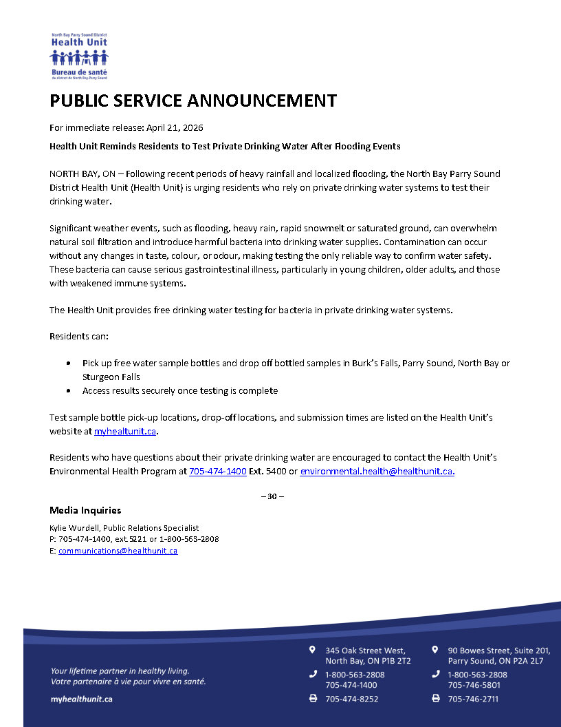 Health Unit Reminds Residents to Test Private Drinking Water After Flooding Events - April 21, 2026