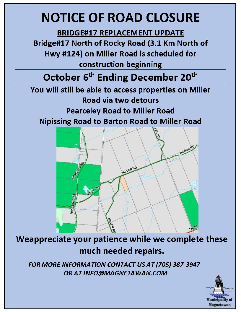 NOTICE OF ROAD CLOSURE MILLER ROAD BRIDGE #17 REPAIRS